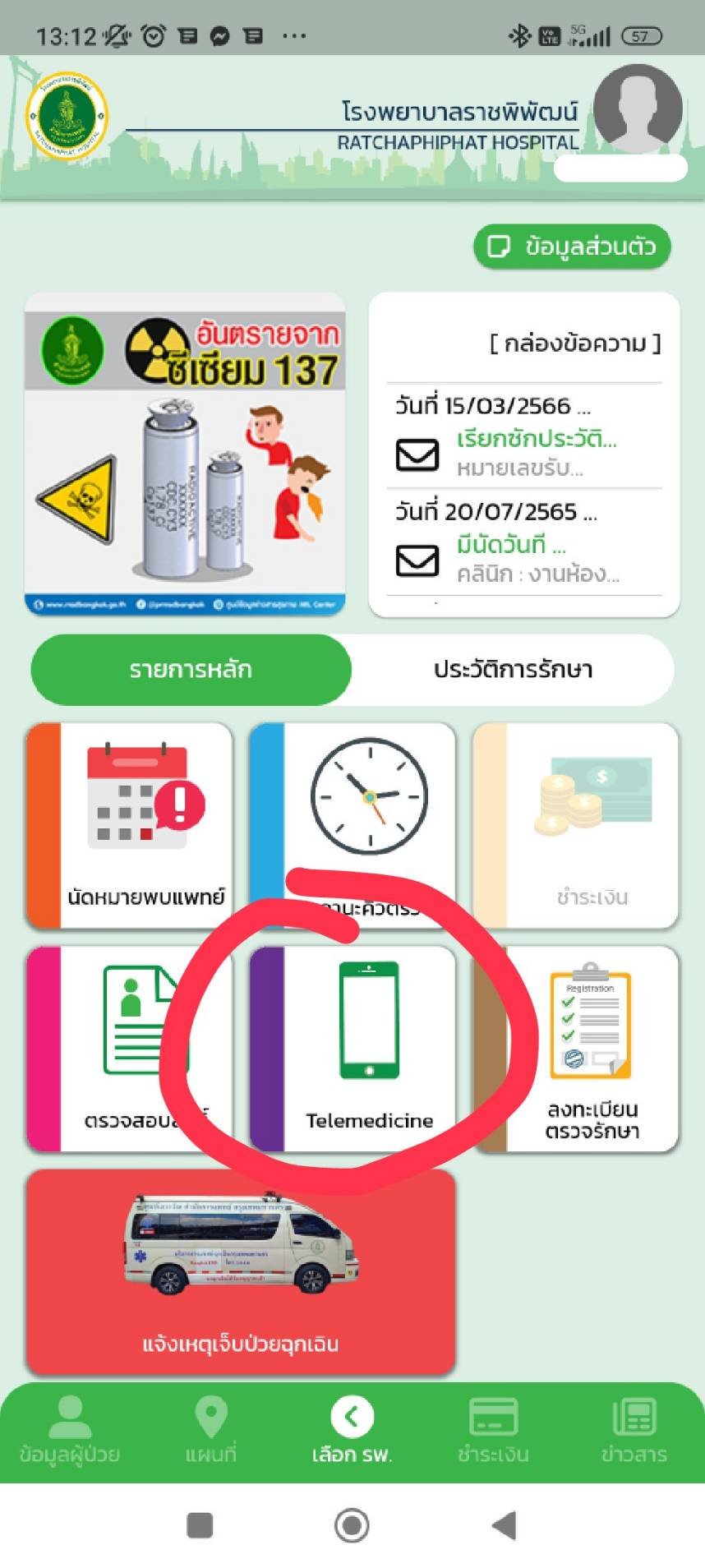 เมื่อถึงเวลานัดหมาย จะมี sms ส่งไปที่ โทรศัพท์ และให้ท่านกดปุ่ม Telemedicine เพื่อพบแพทย์ออนไลน์ได้เลยครับ
